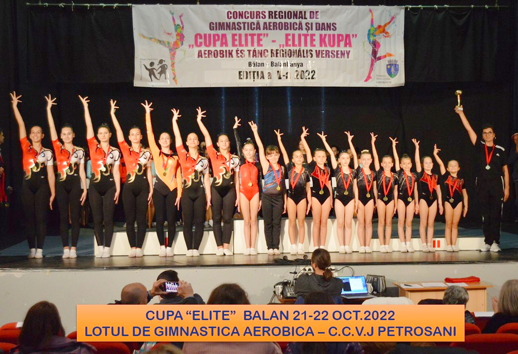 II.) In perioada 21-22 octombrie lotul de gimnastica aerobica de la Clubul Copiilor Valea Jiului - sediul central Petrosani, coordonat de maestrul antrenor profesor Adriana Popa a participat la Concursul national de gimnastica aerobica " CUPA ELITE" ,Balan -Jud Harghita.
