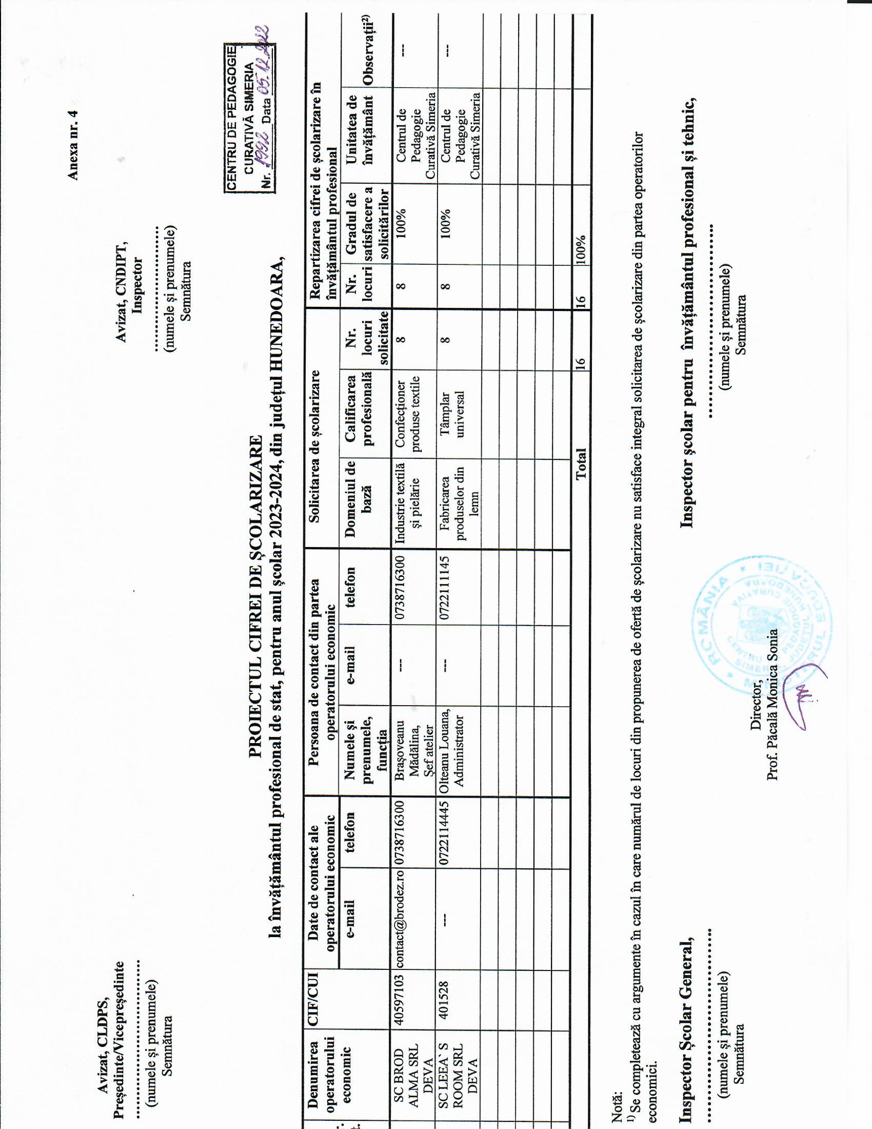 În conformitate cu Ordinul M.E. nr. 6172/28.10.2022 privind aprobarea Calendarului etapelor şi acţiunilor pentru stabilirea cifrei de şcolarizare în învăţământul dual şi în învăţământul profesional pentru anul şcolar 2023-2024, precum şi a modelelor pentru avizarea de către Comitetul local de dezvoltare a parteneriatului social, Centrul Naţional de Dezvoltare a Învăţământului Profesional şi Tehnic şi unitatea administrativ teritorială a Proiectului cifrei de şcolarizare în învăţământul dual şi în învăţământul profesional, vă reamintim că până la data de 25 noiembrie 2022 se primesc și înregistrează la nivelul Inspectoratului Școlar Județean Hunedoara sau la unitățile de învățământ cu învățământ profesional și dual, solicitările de școlarizare pentru învățământul profesional și dual