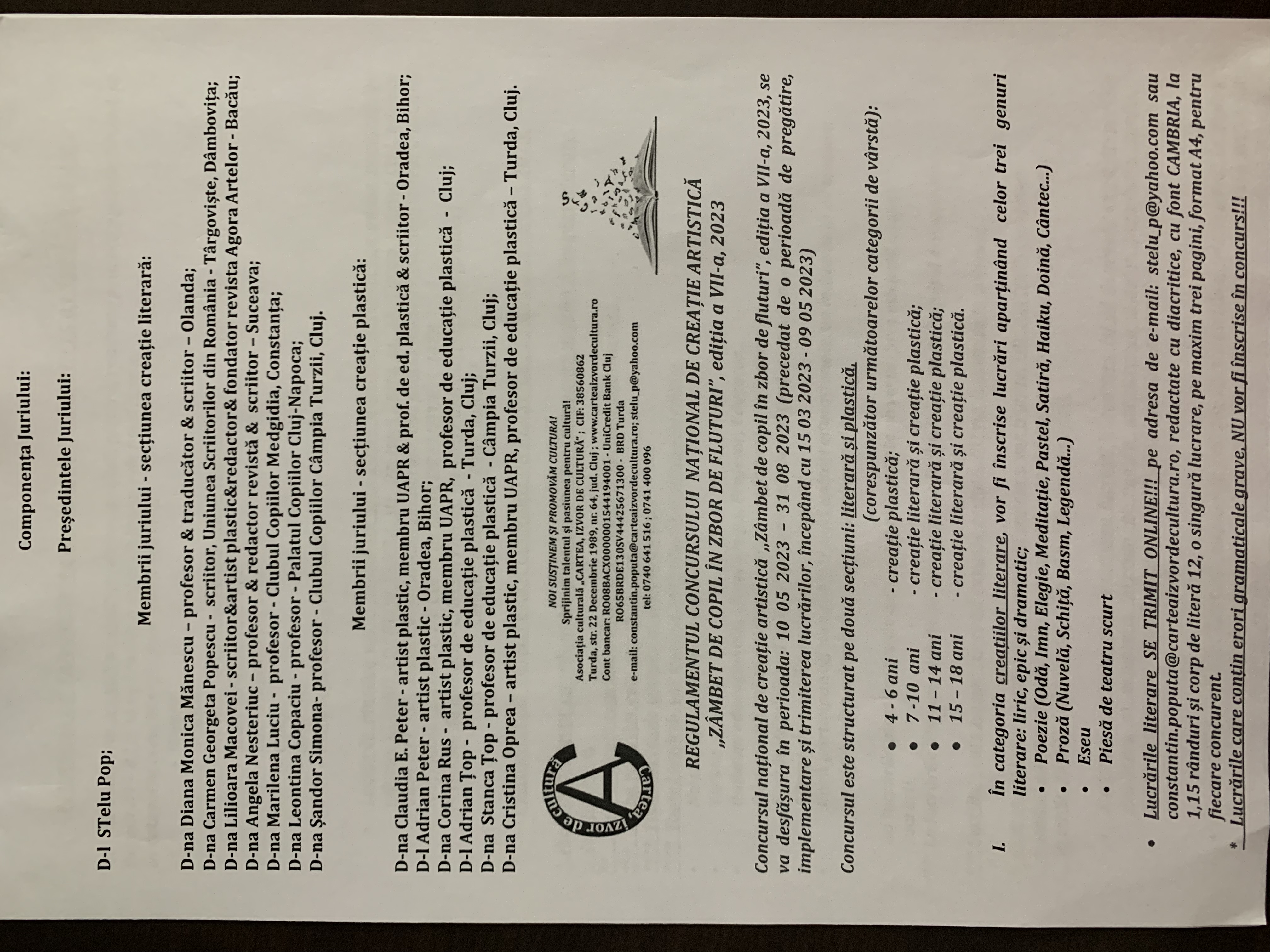Asociația culturală „Cartea, izvor de cultură”, în parteneriat cu Palatul Copiilor Cluj & Clubul Copiilor Turda, județul Cluj, organizează, în perioada 15.03.2023-31.08.2023, Concursul Național de creație artistică „Zîmbet de copil în zbor de fluturi”, ediția a VII-a 2023; concurs destinat copiilor cu vârste de la 4 la 18 ani.