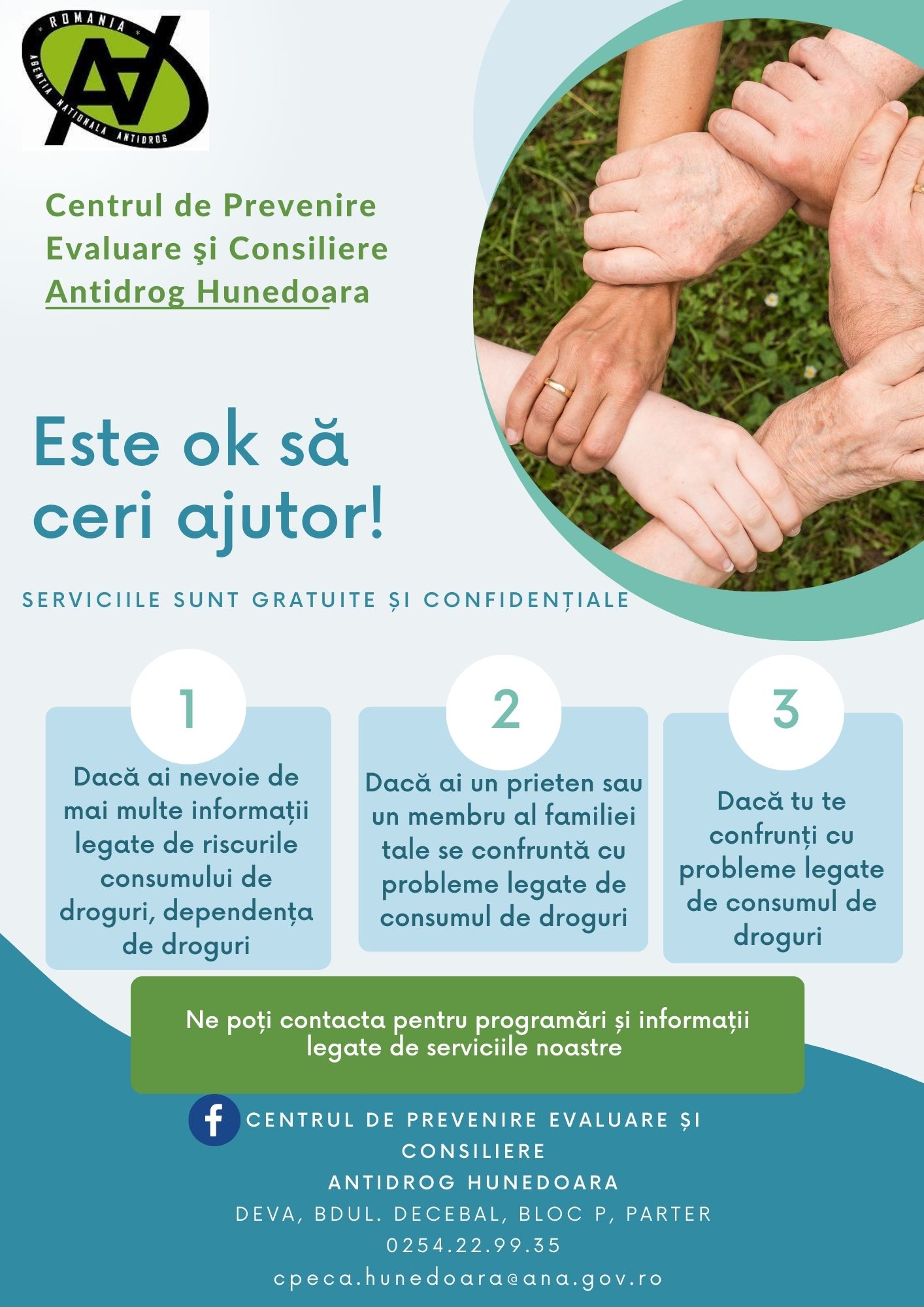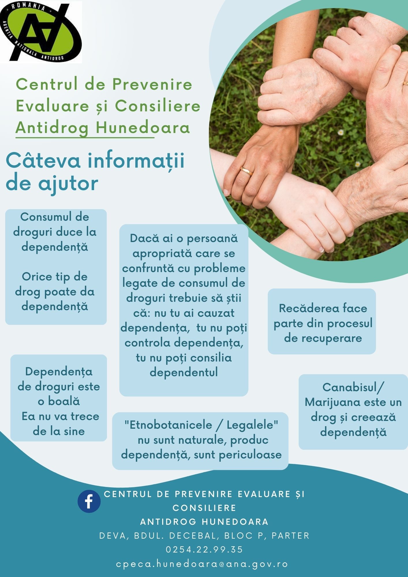 În conformitate cu adresa IȘJ Hunedoara nr. 1429/13.04.2023, Agenția Națională Antidrog, prin Centrul de Prevenire, Evaluare și Consiliere Antidrog Hunedoara (CPECA Hunedoara), desfășoară activități de informare și conștientizare cu privire la efectele și riscurile consumului de droguri, precum și dezvoltarea unor atitudini și practici de viață sănătoasă la nivelul populației, acordând asistență pentru persoanele consumatoare de droguri și aparținătorii acestora. Pe parcursul lunii aprilie a acestui an, CPECA Hunedoara desfășoară campania națională „Consumul de droguri ne privește pe toți” și vă pune la dispoziție o serie de materiale informative, pe care le aveți în atașament.