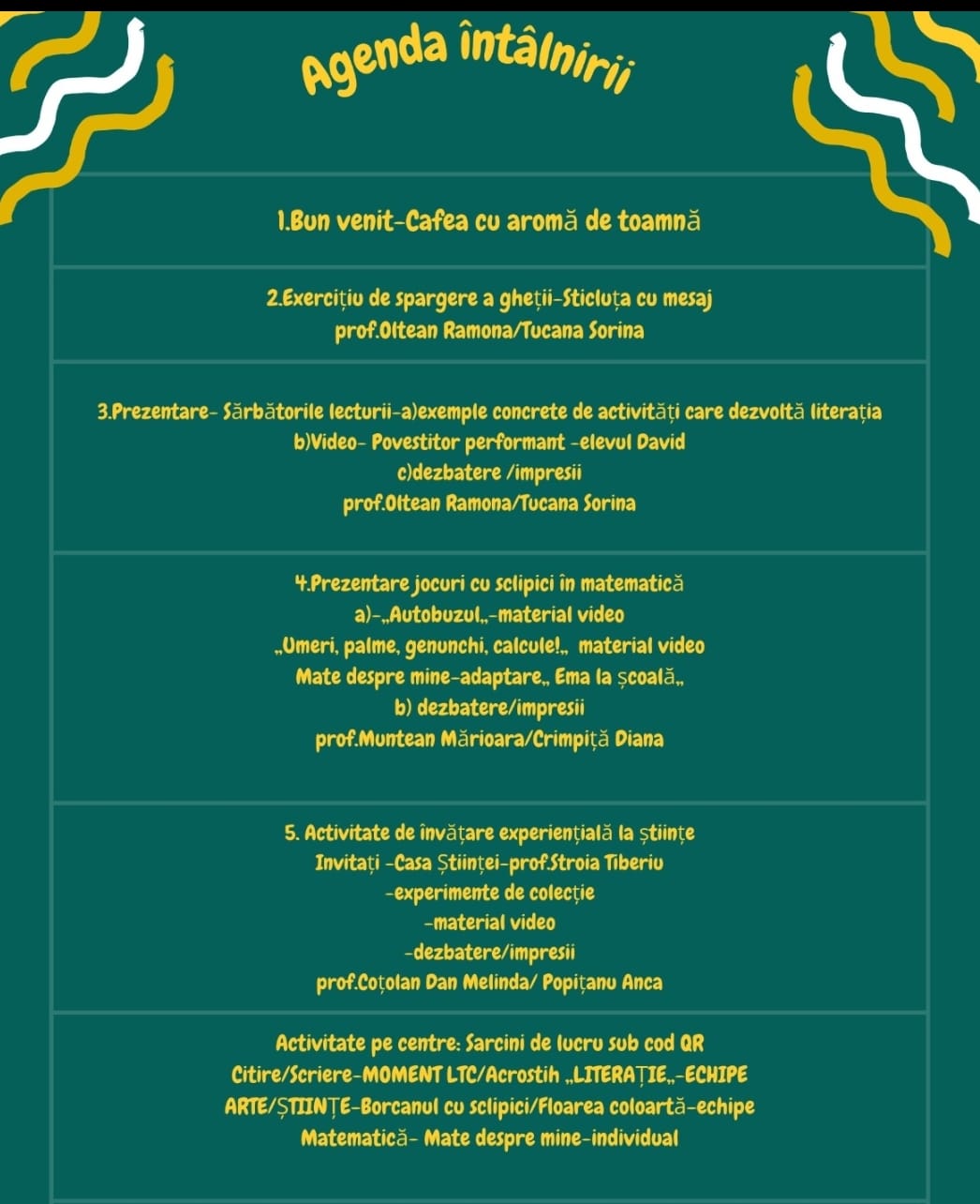 • Managementul clasei și relația cu comunitatea, prof. înv. primar Ramona Oltean, prof. înv. primar Petronela Luncan, prof. înv. primar Mihaela Dobra, prof. înv. primar Ligia Lac