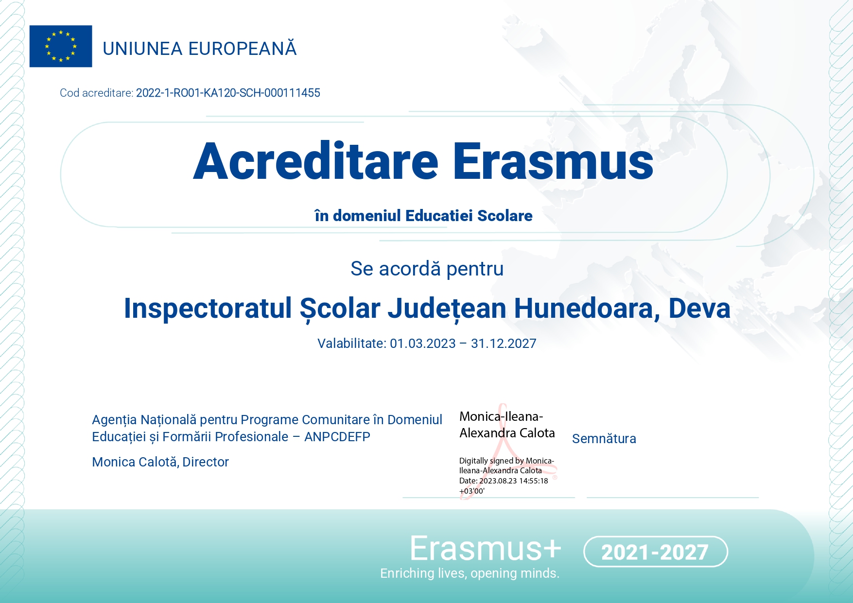 Inspectoratul Școlar Județean Hunedoara, în calitate de lider de consorțiu, implementează în perioada 2023-2027, un proiect de acreditare Erasmus+ în domeniul educației școlare.