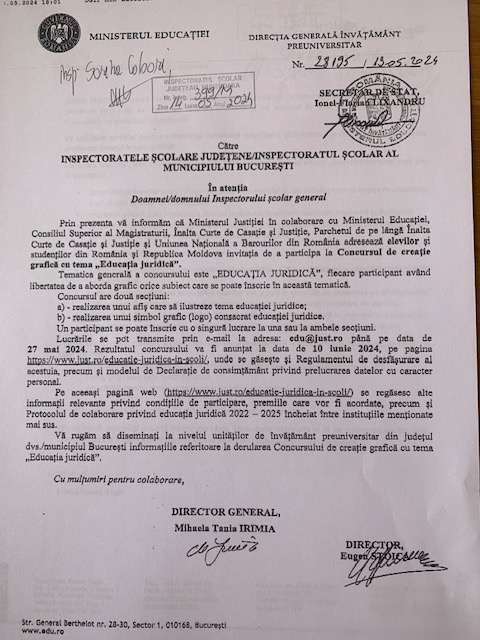 In conformitate cu adresa ISJ nr. 399/M/13.05.2024, Ministerul Justiției în colaborare Ministerul Educației și alte instituții importante, adresează elevilor și studenților invitația de a participa la Concursul de creație și grafică cu tema „Educație Juridică”.