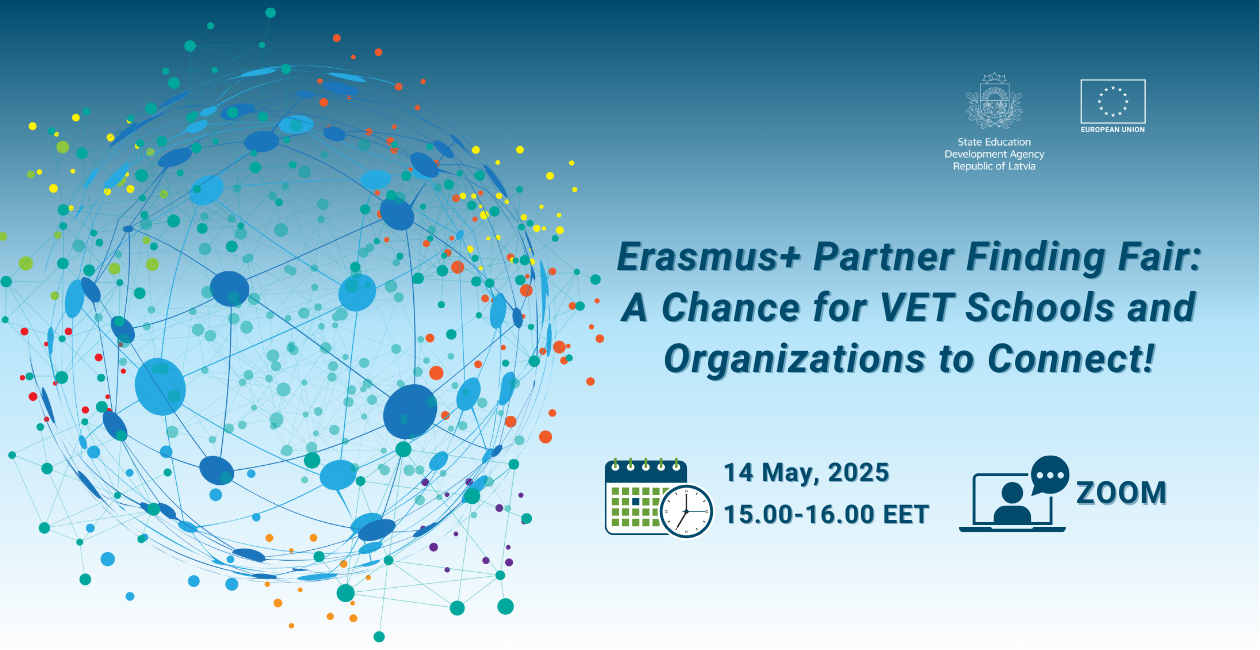 On behalf of the VET LV Team and the Latvian National Agency for the Erasmus+ Programme in the Education and Training sector (VIAA), we invite Vocational Education and Training (VET) schools and institutions to participate in the Erasmus+ Partner Finding Fair. This virtual networking event is designed to support partnership building and project development within the Erasmus+ programme. The event will take place on 14 May 2025 from 15:00 to 16:00 (EET) on the Zoom platform.