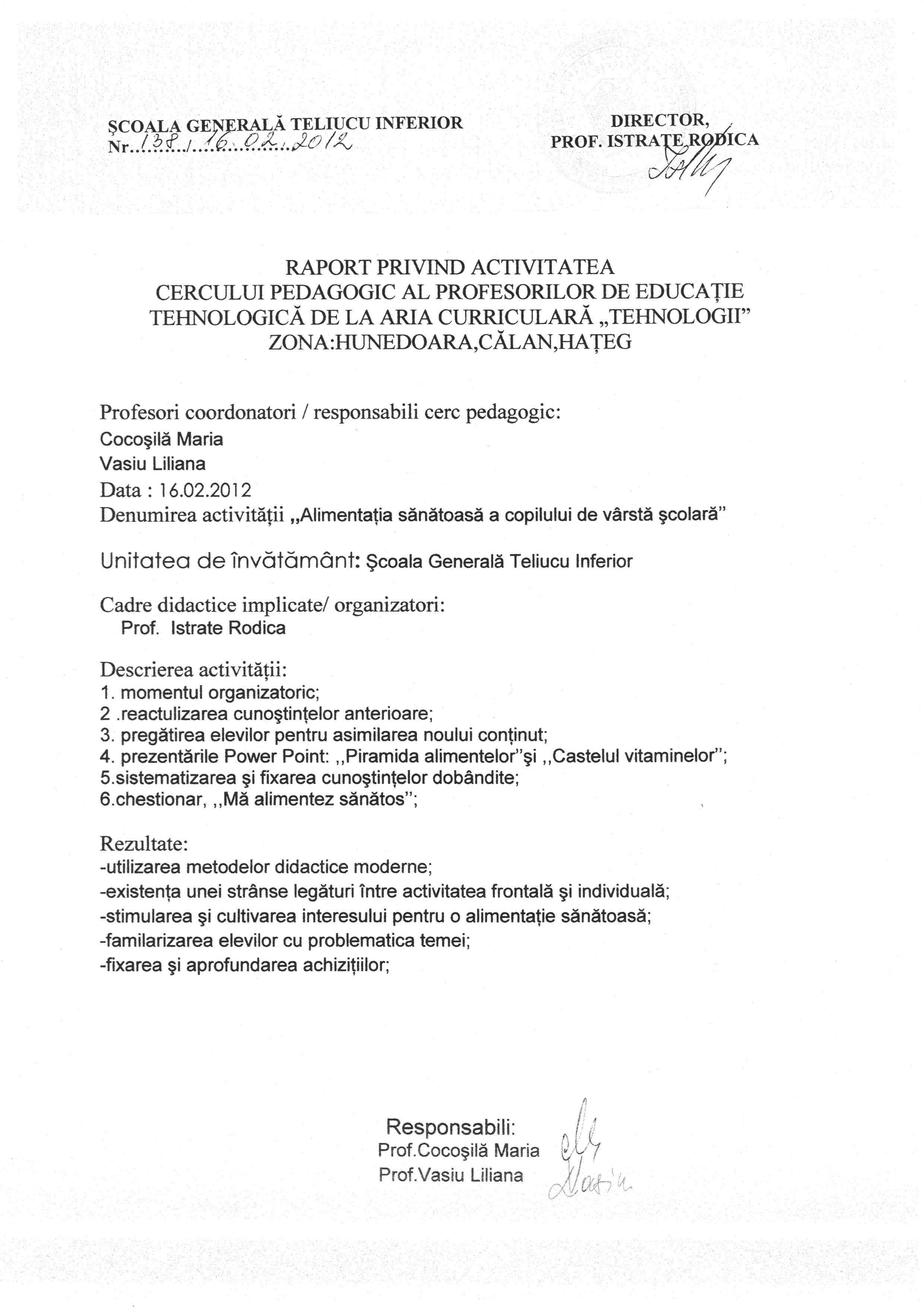 Vă anunţăm că în data de 16.02.2012, ora.13.00, conform graficului de activităţi, la Şcoala Generală Teliucu Inferior, se va desfăşura activitatea metodică "Alimentaţia sănătoasă a copilului de vârstă şcolară" , destinată cadrelor didactice care predau disciplina "Educaţie Tehnologică".