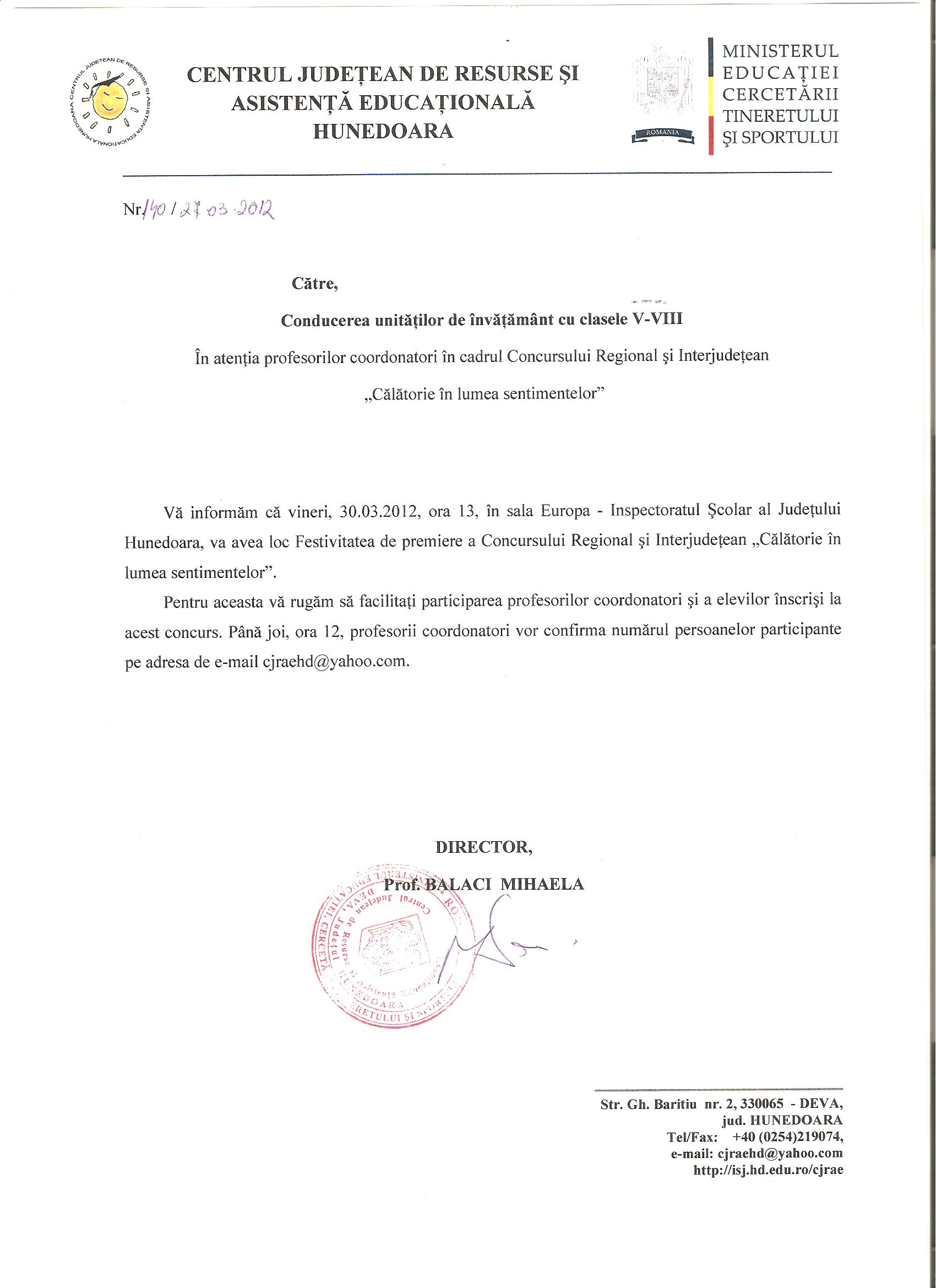 Va informam ca vineri 30.03.2012, ora 13 la sediul Inspectoratului Scolar al Judetului Hunedoara va avea loc festivitatea de premiere a Concursului Educaţional Regional si Interjudetean "Calatorie in lumea sentimentelor".