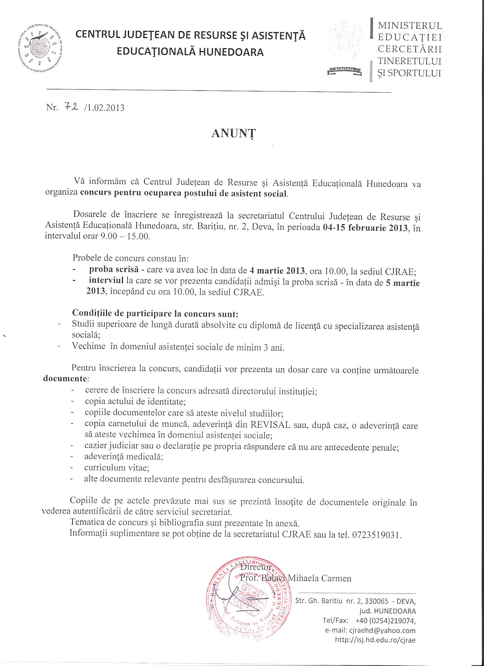 concurs pentru ocuparea postului de asistent social