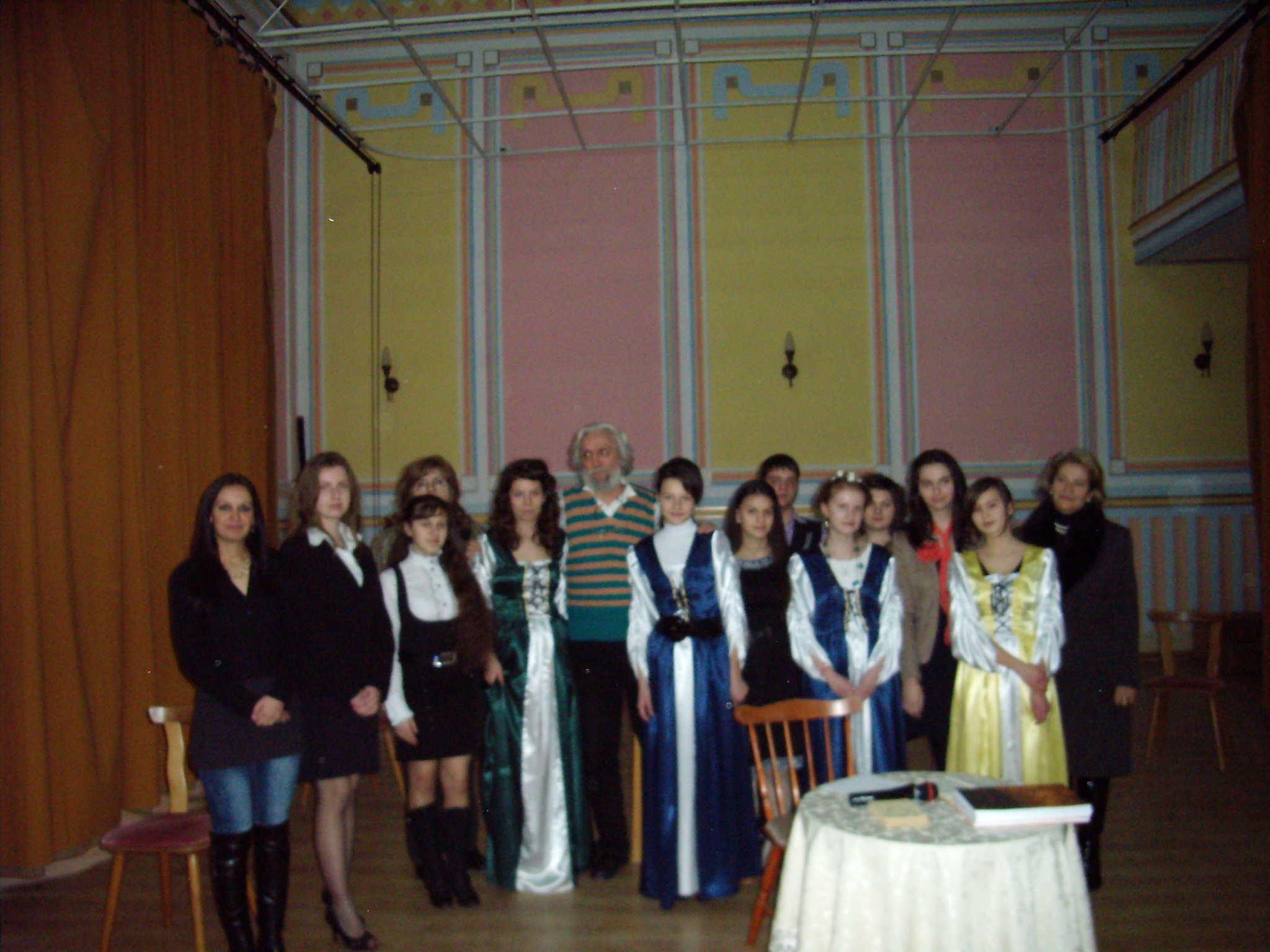 P4020090.JPG- MARȚI-2.04.2013 –Lansare de carte și CD: SONET-Antologie românească și Louise Labe-sonet de Florian Chelu Madeva(discipol al lui Noica), cel care a pus pe muzică cele 154 de sonete ale lui Shakespeare și a înregistrat la Oficiul Român al Dreptului de Autor(2001) noțiunea de sonet musical(conceput prin similitudine cu sonetul literar, pornind de la două măsuri din J.S.Bach, măsurile 169 și 170 ale Fugii din Sonata a-3-a pentru vioară). Cu acestă ocazie elevele: Lavinia Aramă IXC, Andreea Lupșa IX C, Ioana Onescu IX C, Raluca Pîrlea IX C, Diana Moiș IX A, Alexandra Teletin IX A, Adina Frate XD, Damaris Șuteu XD, Eliza Prepeliță XI A și elevul Nicolae Moisă IX A au prezentat un recital de poezie Louise Labe, in română și franceză. În final Florian Chelu și Alexandrina Chelu au susținut un concert de chitară clasică și voce din sonetele musicale ale autorului.